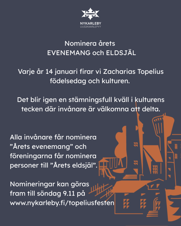 Nominera årets EVENEMANG och ELDSJÄL 9.11.2025 Nomineringar kan göras fram till söndag 9.11 på www.nykarleby.fi/topeliusfesten. Gå till "Aktuellt"