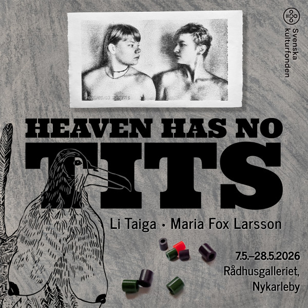 ”Heaven Has No Tits” är en gemensam utställning av konstnärerna och älskarna Li Taiga och Maria Fox Larsson. Utställningen är en visuell queer kärlekssång som berättas genom en serie målningar, vardagliga skisser, mekaniska skulpturer, leksaker som gjorts allvarliga och allvar som gjorts till leksaker. Li och Fox skildrar och reflekterar både sig själva och varandra när de rör sig genom den tredimensionella världen som omger dem, ibland i samma fysiska rum, ibland åtskilda av tusentals kilometer och landsgränser.