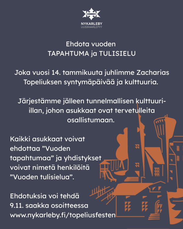 Ehdota vuoden TAPAHTUMA ja TULISIELU 9.11.2025 Ehdotuksia voi tehdä 9.11. saakka osoitteessa www.nykarleby.fi/topeliusfesten. Siirry "Ajankohtaista"-sivulle